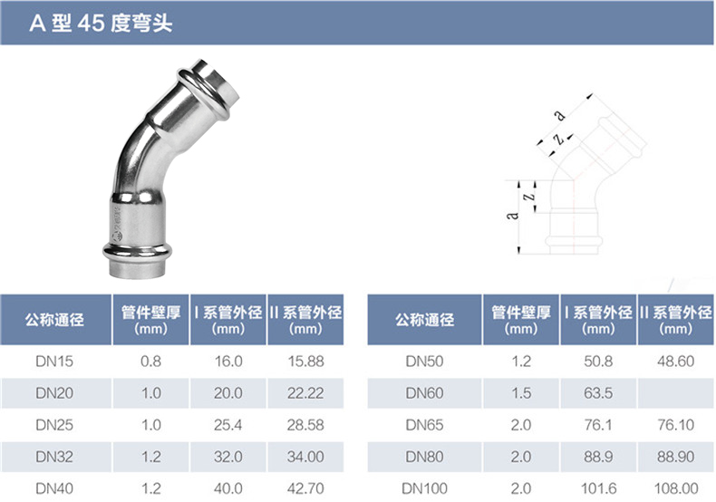 A型45度彎頭丨材質(Grade): 304/304L、316L 丨原料來源(Source of raw materials): 全部符合相關國家標準要求,用料來源酒鋼、太鋼、張浦、東特等 丨焊接方式(Welding method): 氬弧焊或等離子焊(TIG OR PLASMA在線)+氬弧焊(TIG離線) 丨執(zhí)行標準(Executive standard): GB/T 19228.2-2011 GB/T12771 丨參數(shù)對照表(Parameters):